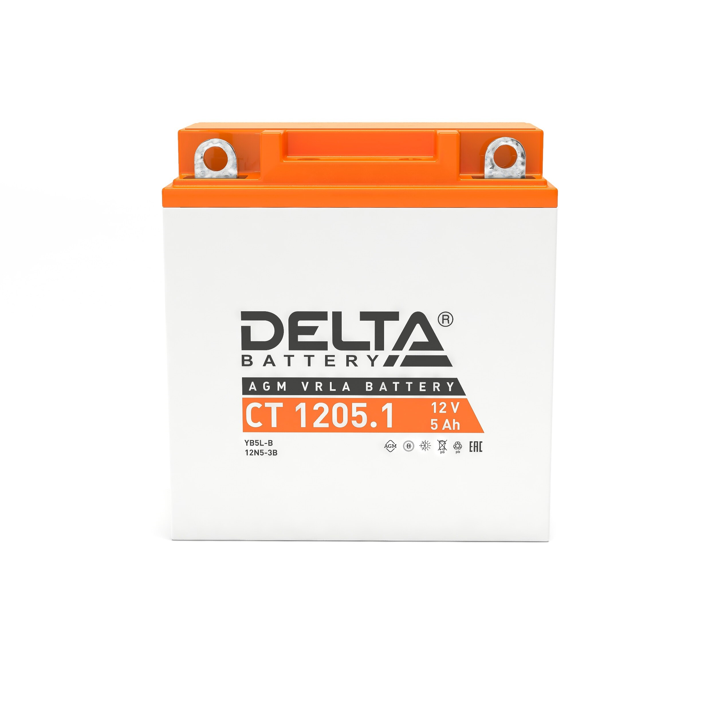 Аккумуляторная батарея для мотоцикла CT 1205.1. Емкость: 5 Ач. Пусковой ток: 65А. Полярность: обратная. Размеры: 120x61x129 мм. Производитель: Delta.