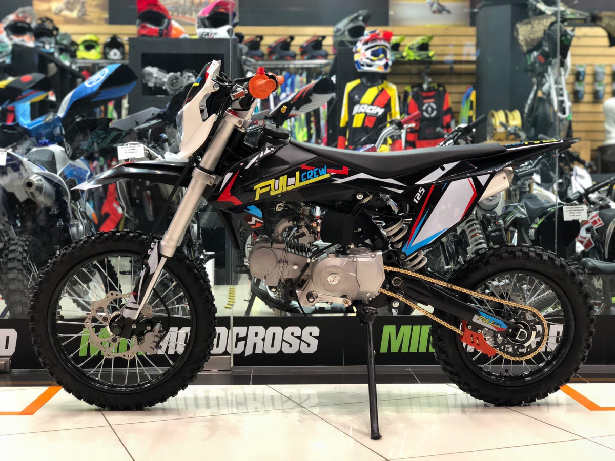 Питбайк от молодого российского бренда Full Crew, модель получилась название FC125 17/14. В ней собраны все ключевые моменты для покорения сердца питбайкера. Трубчатая стальная рама, дисковые гидравлические тормоза, надежный и проверенный временем двигатель YX 125 с механической четырехступенчатой коробкой передач и фара. А самый огромный плюс – это демократичная цена и наличие электростартера на питбайке Full Crew FC125 17/14 черный.